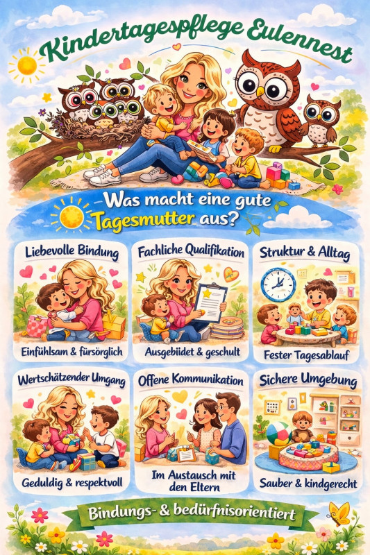 In der Kindertagespflege ist die pädagogische Qualifizierung der Betreuungspersonen Grundvoraussetzung. Vom Jugendamt habe ich die Pflegeerlaubnis 2019 erhalten. Seit dieser Zeit besuchen wir mehrmals jährlich Fortbildungen, die unser Wissen in verschiedenen Bereichen der Kinderbetreuung immer wieder erweitern. Dazu zählen Erste-Hilfe-Kurse, Kurse über kindgerechte Ernährung oder auch Kurse zu neuen Mal- und Bastelideen mit den Kindern. So wird es bei uns nie langweilig und wir haben viel Spaß miteinander.